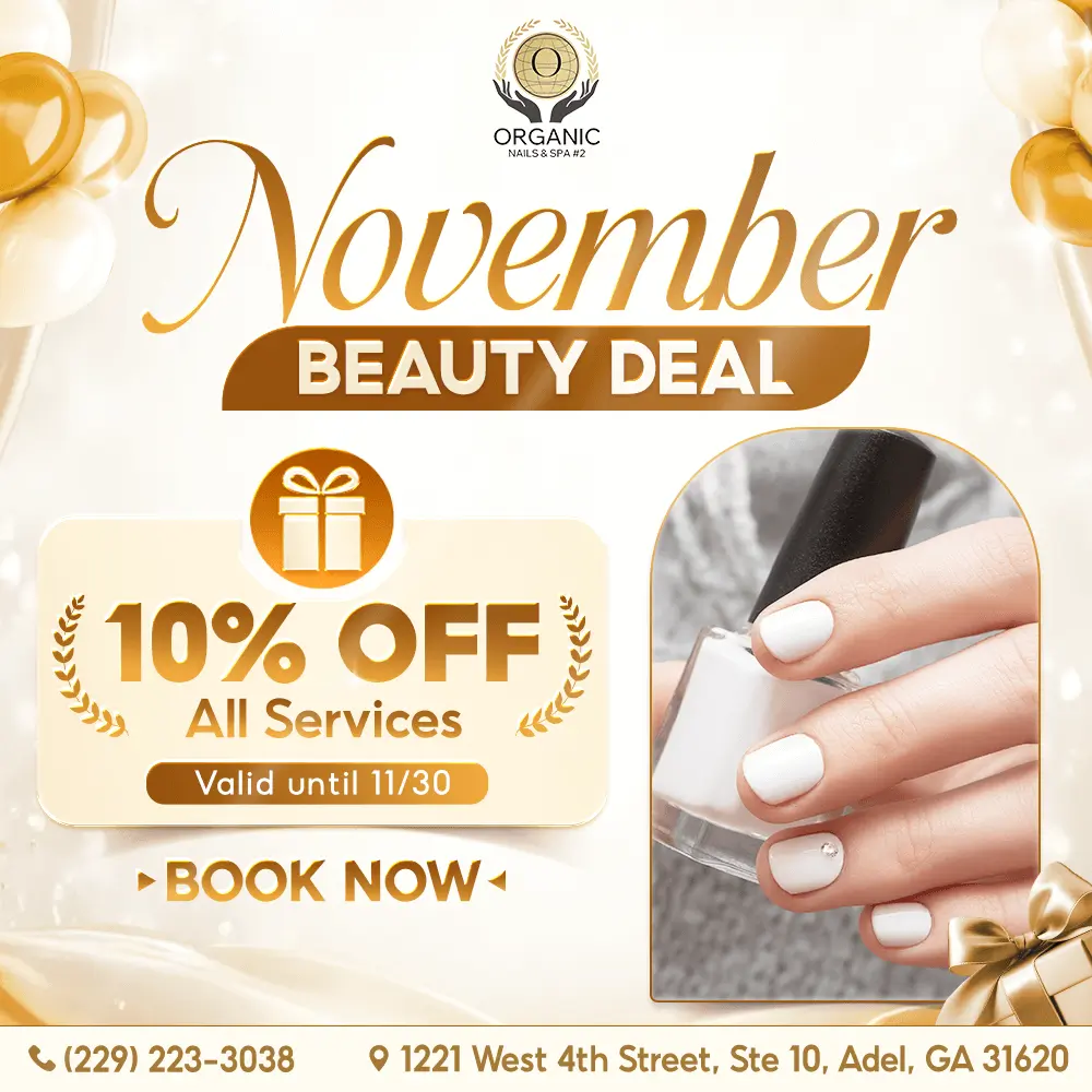 Welcome to Organic Nails & Spa #2, your relaxing beauty hideaway located at 1221 West 4th Street, Ste 10, Adel, GA. We’re more than just a nail salon — we’re a place where wellness, elegance, and clean beauty come together. Every detail in our salon is designed with care to create a peaceful, rejuvenating experience. From our gentle techniques to our organic product selection, your well-being is always front and center.